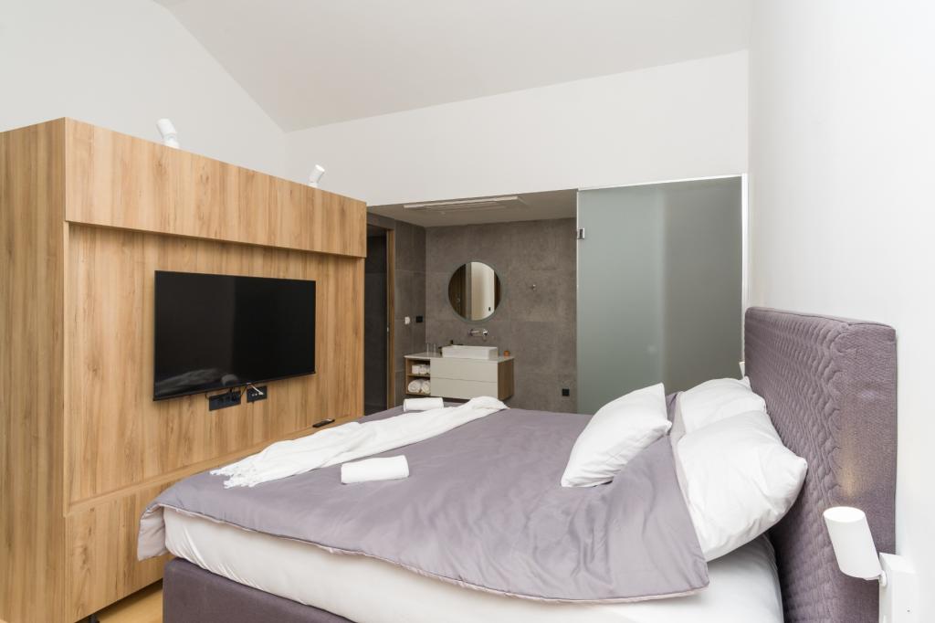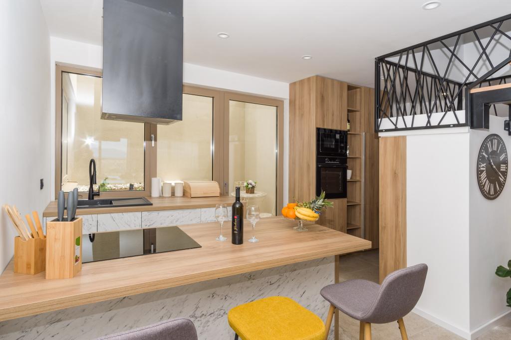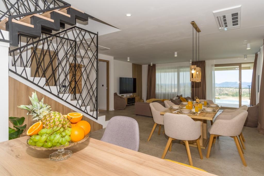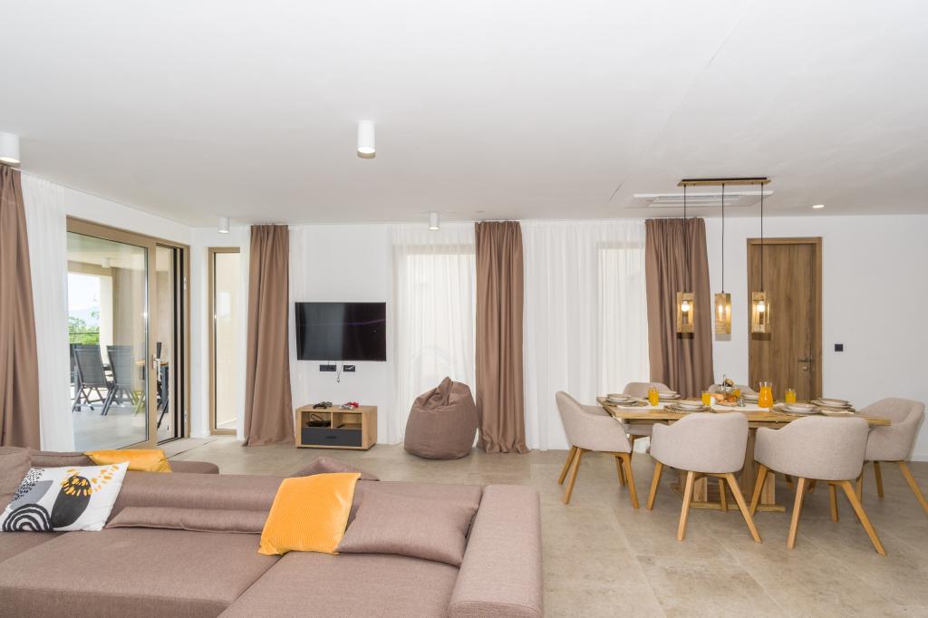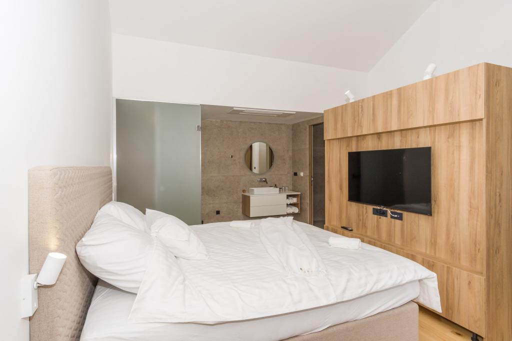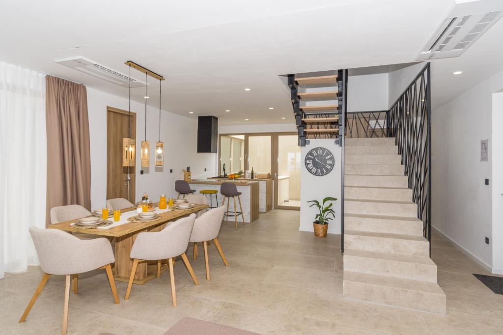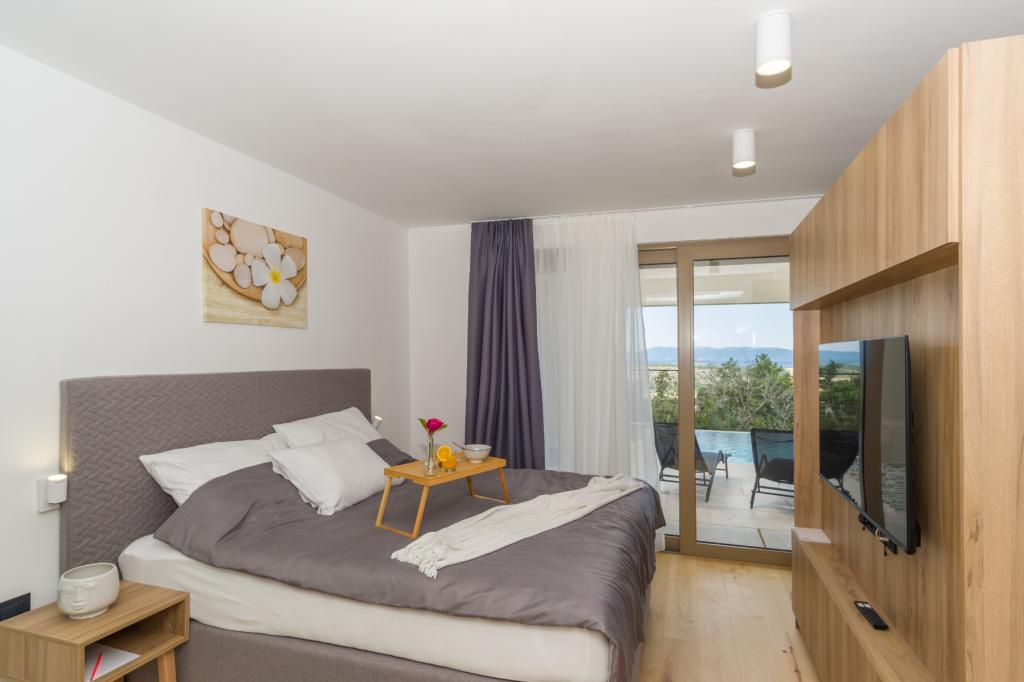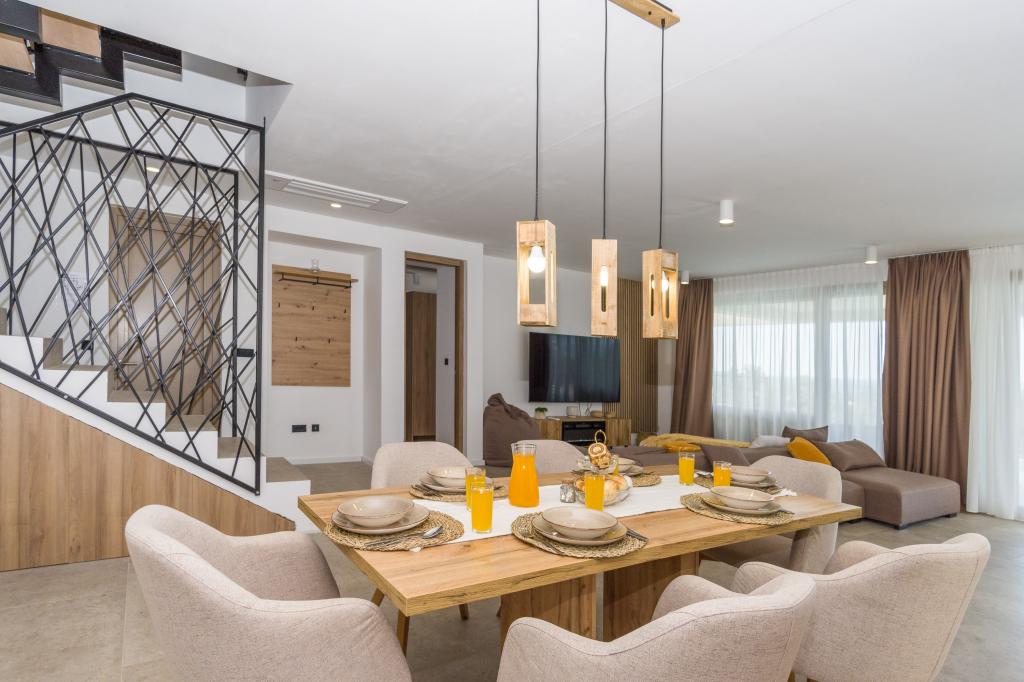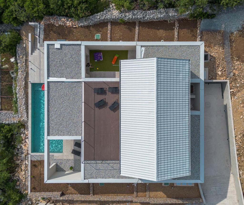 Ny. En fuldt udstyret ny villa med en swimmingpool, der måler 9x4 m, ligger i Šmrika, nær turiststedet Crikvenica. Villaen ligger et roligt sted og er skjult for indsyn. Fra hvert hjørne af huset er der udsigt over havet, øen Krk, øen Cres, Istrien og fra terrassen på første sal, Rijeka og Opatija. Villaen har 3 store soveværelser og badeværelse i hvert værelse samt stor stue med køkken og spisestue. Ved siden af poolen er der også et udendørs køkken med gasgrill. For at børnene ikke skal kede sig, er der legeplads 4, og for de mindste er der en legeplads med hus og rutsjebane. Voksne kan slappe af i fitnesscentret. Ved siden af køkkenet er der en lille have med krydderier, der kan bruges i madlavningen - basilikum, rosmarin, cherrytomater... Afstanden fra sandstranden i Jadranovo er 4 km. I en afstand af kun 1 km er der Bura kartingbane og en æselfarm, yderst attraktiv for børn.