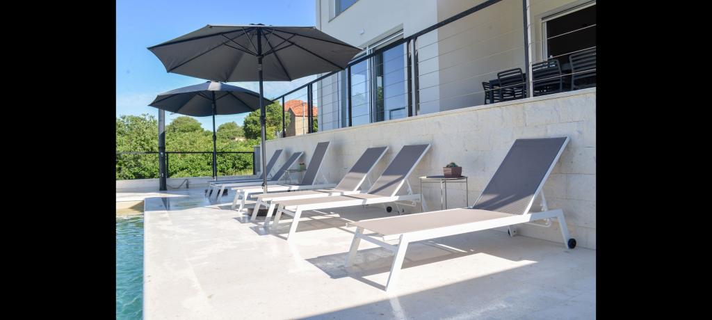 Villa til leje med pool – Pakoštane/Vrana (op til 10 personer)** En luksuriøs villa i tre etager med 5 soveværelser og 3 badeværelser udlejes, ideel til familier eller grupper. Den ligger i en rolig del af Pakoštane, nær Vrana-søen og kun 5 minutters kørsel fra stranden. Villaen tilbyder en privat pool med hydromassage, en tagterrasse med udsigt over havet og søen, en udendørs grill, et fuldt udstyret køkken, Wi-Fi, Smart TV, aircondition og en vaskemaskine. Gratis parkering og en basketballkurv er også tilgængelige. Villaens særlige kendetegn er dens beliggenhed - tæt på strande, restauranter og faciliteter, men afsides nok til at sikre fred og privatliv. **Kapacitet:** 10 personer **Pris:** Efter aftale, afhængigt af dato og antal personer. Vi ser frem til din ankomst!