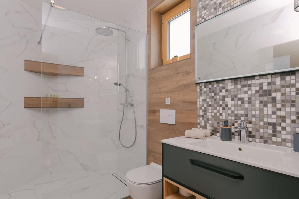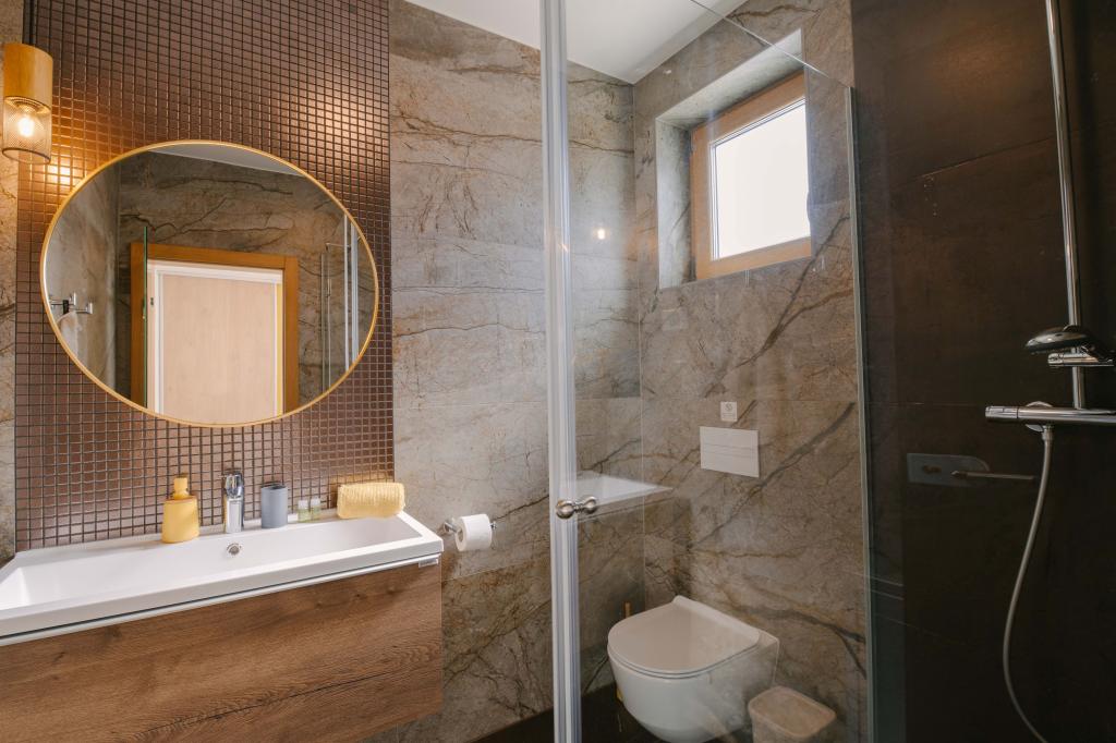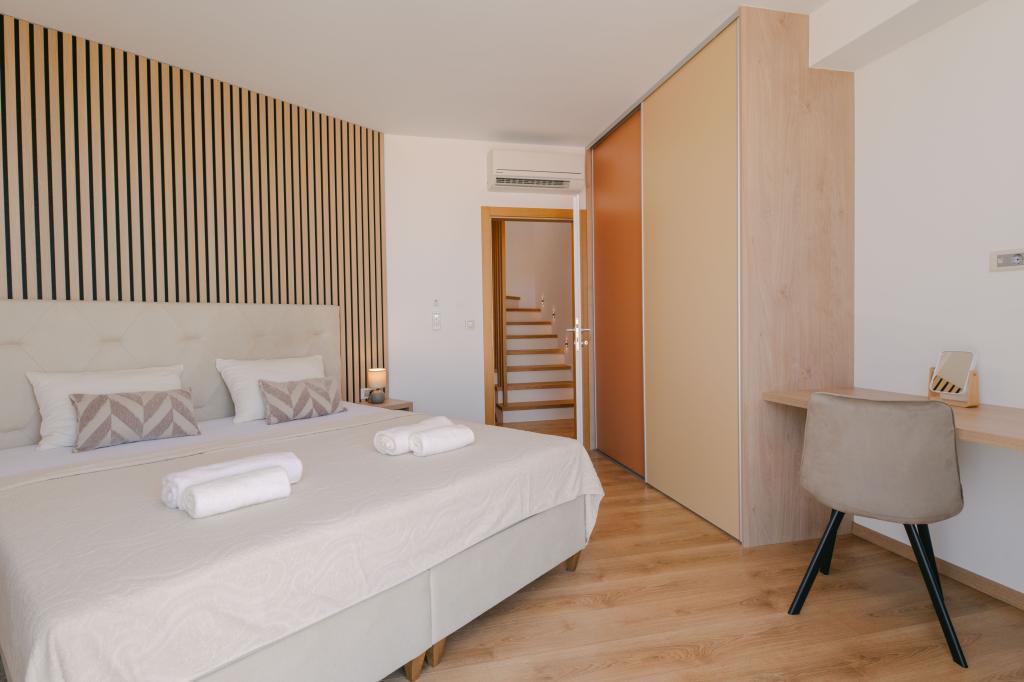 Tre moderne soveværelser er placeret ovenpå, mens et gæsteværelse er placeret i kælderen. Alle badeværelser er udstyret med topmoderne Grohe- og Laufen-armaturer, prestigefyldte designer-keramiske fliser og elegante glasdøre. Huset er officielt kategoriseret af Republikken Kroatiens turistministerium, hvilket giver mulighed for komfortabel indkvartering for 9, endda 10 gæster. Den åbne stue og spisestue, såvel som hvert soveværelse, er udstyret med individuelle klimaanlæg med en stille tilstand, perfekt til en fredelig søvn. Det moderne køkken, fra det berømte østrigske mærke DanKüchen, er fuldt udstyret med topmoderne apparater, herunder et køleskab med ismaskine og en koldtvandsbeholder.