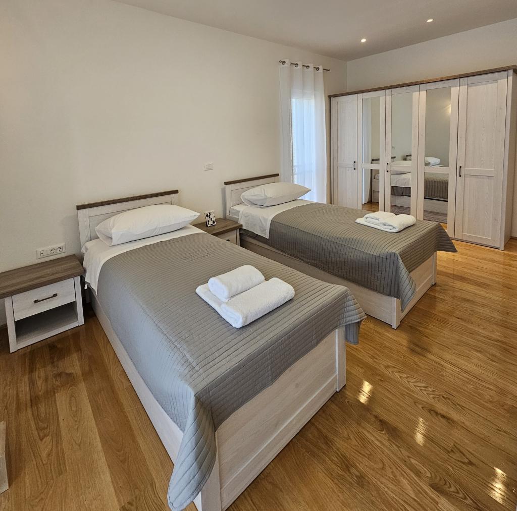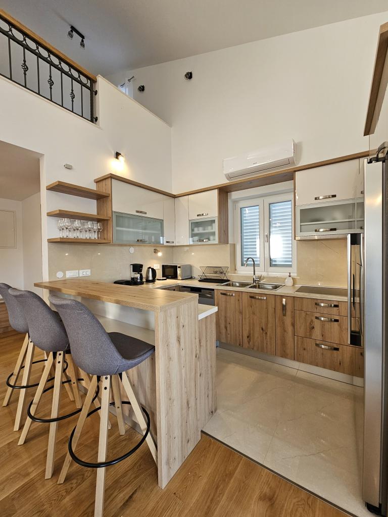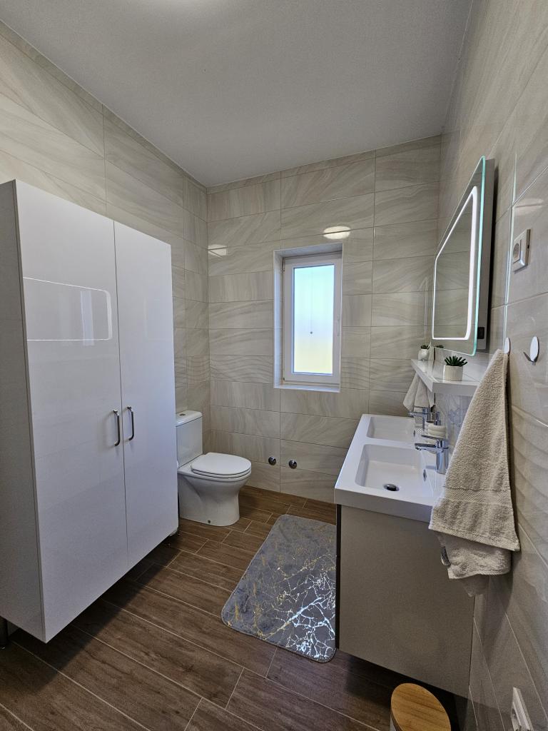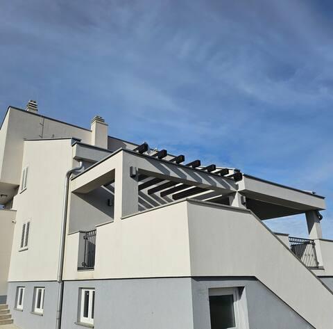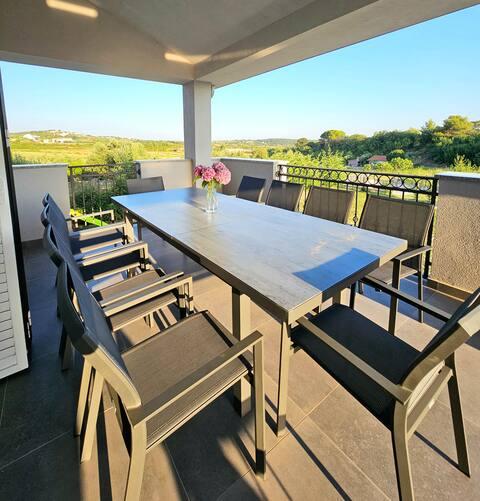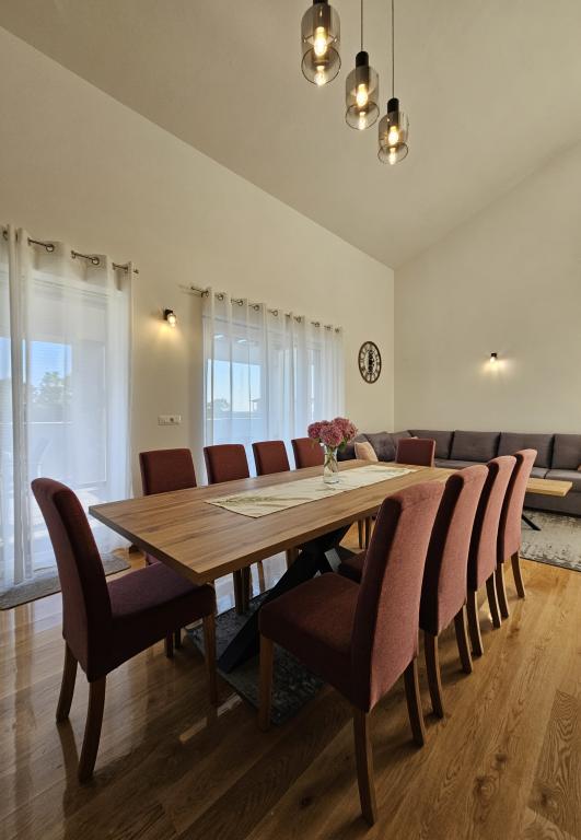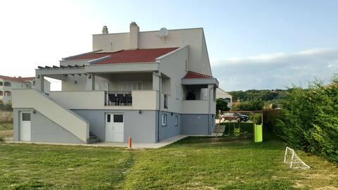 Velkommen til jeres 324 m² store familieferiehus nær Zadar — et rummeligt hjem designet til afslapning og sjov. Forældre kan slappe af i det private spabad eller holde sig aktive i det fuldt udstyrede fitnesscenter, mens børnene nyder deres egen sikre udendørs legeplads. Huset har komfortabel plads til op til 10 gæster og tilbyder fem omhyggeligt møblerede soveværelser, tre moderne badeværelser, to fuldt udstyrede køkkener, en spiseplads og en lys stue med tv. Et dedikeret arbejdsområde og vaskerum giver ekstra bekvemmelighed ved længere ophold. Gå udenfor i den fuldt indhegnede private have, der sikrer privatliv og sikkerhed, ideelt for familier med børn. Udendørsliv er højdepunktet i dette hjem med to balkoner med liggestole og en stor terrasse med grill, et rummeligt udendørs spiseområde og et afslappende område til solbadning — perfekt til at nyde varme dalmatiske aftener. Der er gratis privat parkering på stedet.