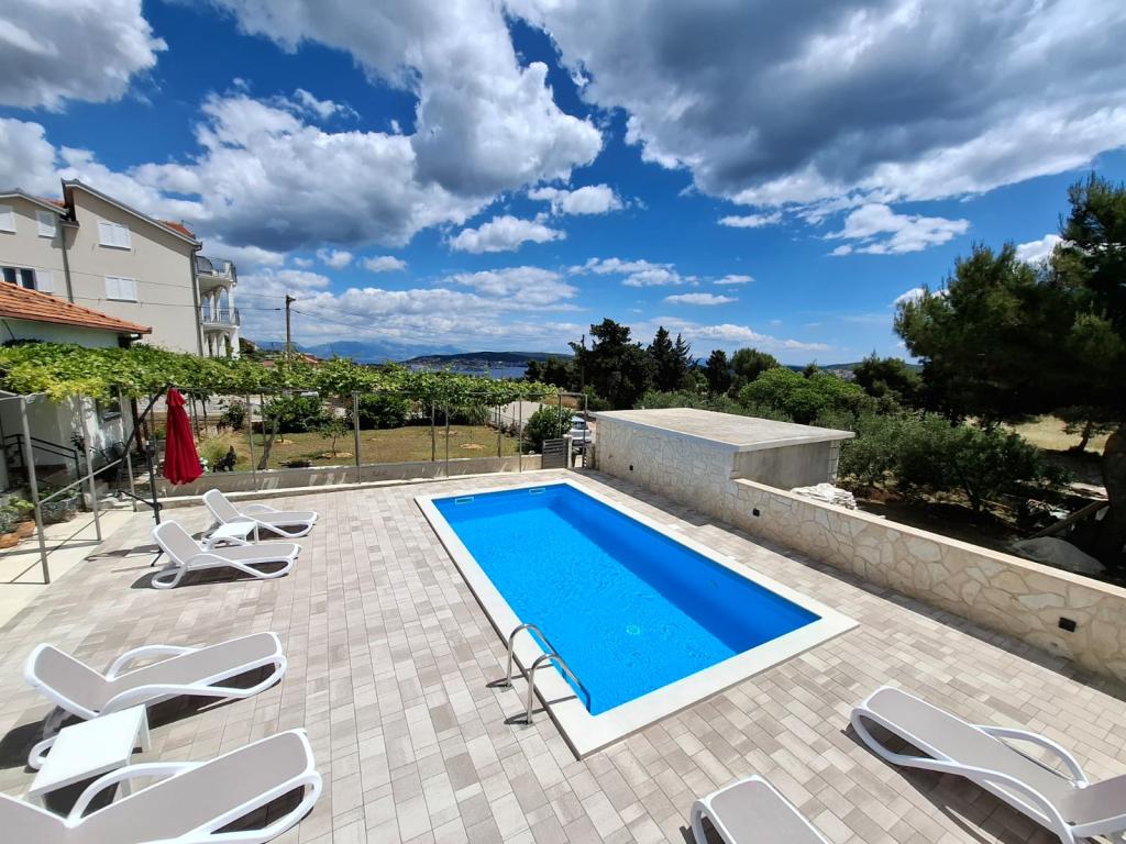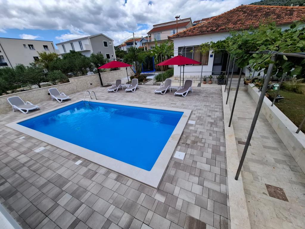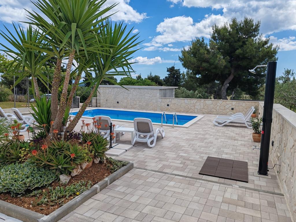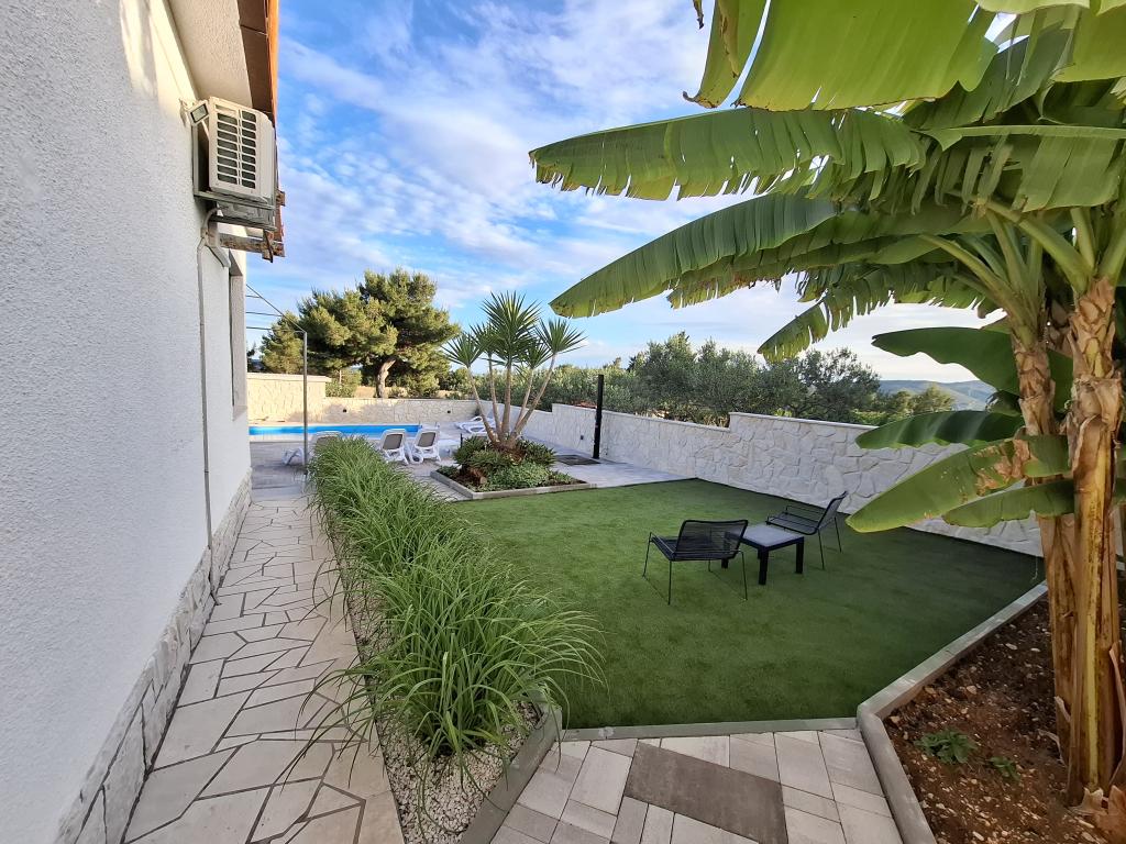 Dette nyrenoverede familiehus med plads til 7 personer ligger i nærheden af Trogir, i Seget Donji-distriktet, i nærheden af Medena Hotel. Huset ligger på en grund på 700 m2 og har 150 m2 boligareal. Et udendørs køkken med bord til 8 personer, et udendørs toilet, en stor grill og en privat swimmingpool giver dig alt hvad du behøver for en behagelig og afslappende ferie. Hele området er moderne indrettet, har aircondition og Wi-Fi. Det indvendige køkken er fuldt møbleret og indeholder alle husholdningsapparater. Huset har 3 moderne indrettede, store soveværelser. Hvert soveværelse har satellit-tv og aircondition. Det større badeværelse har badekar og vaskemaskine. Det mindre badeværelse har en brusekabine. Der er også et lille fitnesscenter i huset. Foran huset er der parkeringsplads til 3 biler. Den store verandahave vil give dig ro og afslapning, og udekøkkenet er et sted at nyde familie og venner. Hele huset og haven med swimmingpool er til rådighed for gæsterne.
