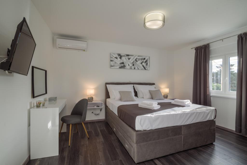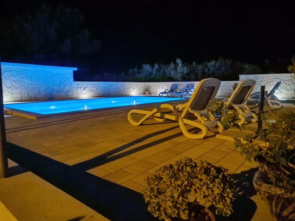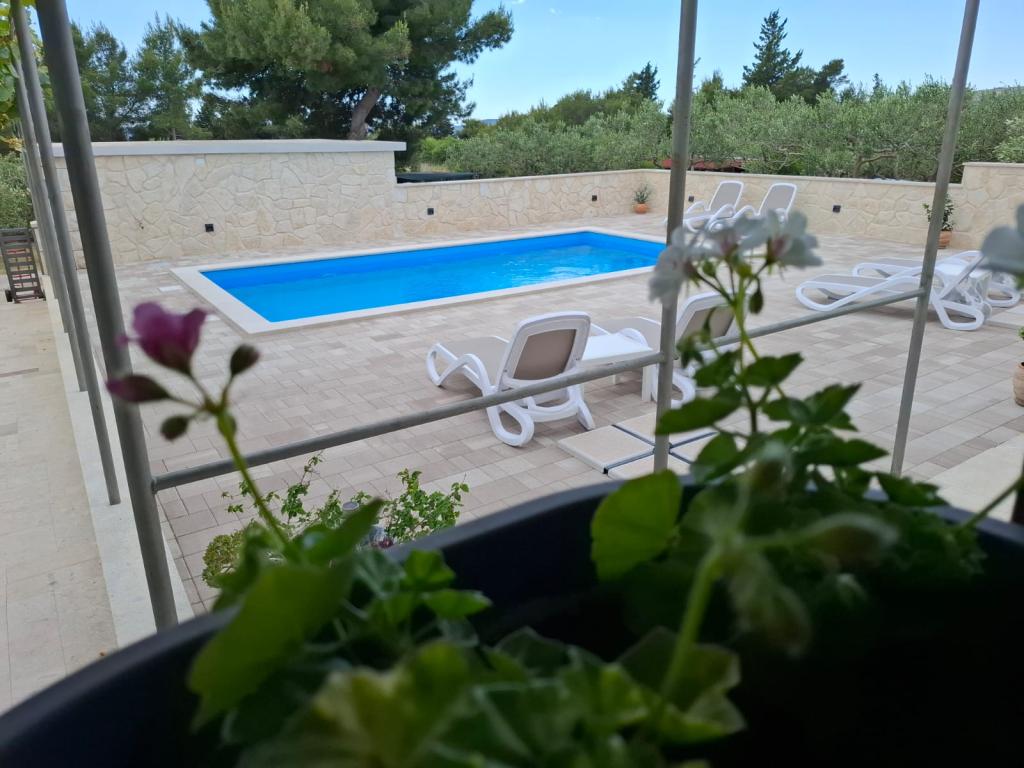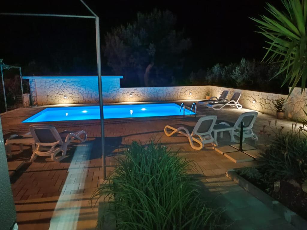 Dette nyrenoverede familiehus med plads til 7 personer ligger i nærheden af Trogir, i Seget Donji-distriktet, i nærheden af Medena Hotel. Huset ligger på en grund på 700 m2 og har 150 m2 boligareal. Et udendørs køkken med bord til 8 personer, et udendørs toilet, en stor grill og en privat swimmingpool giver dig alt hvad du behøver for en behagelig og afslappende ferie. Hele området er moderne indrettet, har aircondition og Wi-Fi. Det indvendige køkken er fuldt møbleret og indeholder alle husholdningsapparater. Huset har 3 moderne indrettede, store soveværelser. Hvert soveværelse har satellit-tv og aircondition. Det større badeværelse har badekar og vaskemaskine. Det mindre badeværelse har en brusekabine. Der er også et lille fitnesscenter i huset. Foran huset er der parkeringsplads til 3 biler. Den store verandahave vil give dig ro og afslapning, og udekøkkenet er et sted at nyde familie og venner. Hele huset og haven med swimmingpool er til rådighed for gæsterne.