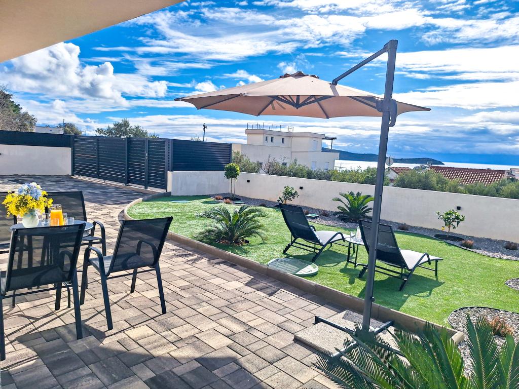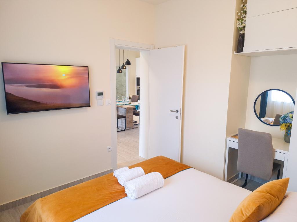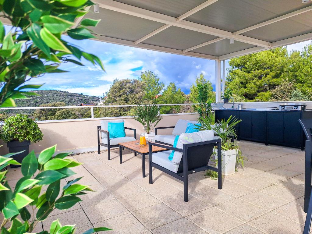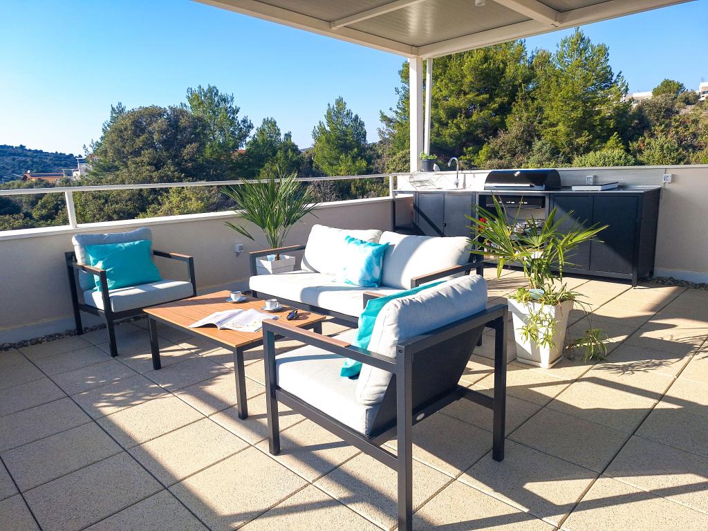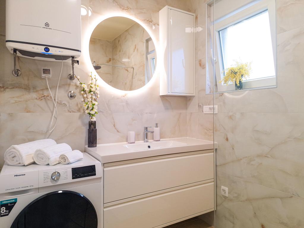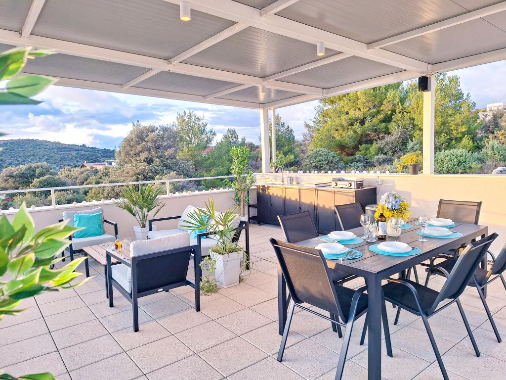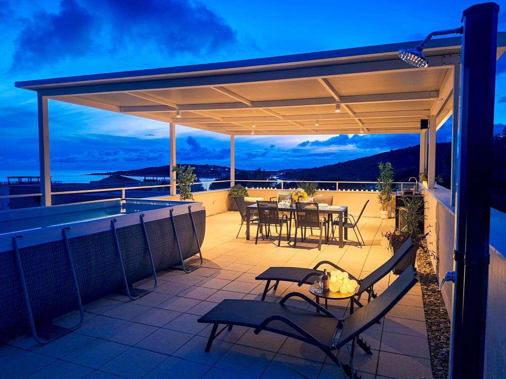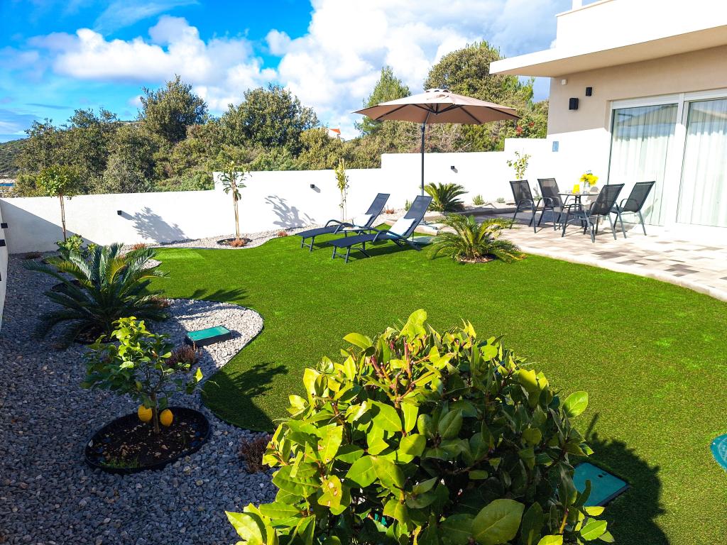 Velkommen til Tesa, en ny, moderne villa, hvor I kan nyde jer selv fuldt ud med familie eller venner. Denne elegante villa til op til 6 gæster tilbyder et fuldt udstyret køkken, et moderne badeværelse med bruseniche og vaskemaskine/tørretumbler samt aircondition og tv i hvert værelse. Tagterrassen med udsigt over havet og øerne har en opvarmet pool, en udendørs bruser og liggestole til afslapning om dagen med jeres yndlingsbog eller musik fra udendørshøjttalere og aftennydelse under stjernerne med et glas af jeres yndlingsdrink. Terrassen med et fuldt udstyret køkken (grill, komfur, køleskab), spisebord og siddeområde giver jer mulighed for at tilbringe hele dagen udendørs. Madlavning med en behagelig brise fra havet vil gøre denne oplevelse yderst behagelig. Den perfekte centrale beliggenhed med alle de nødvendige faciliteter og smukke strande kun 200 meter væk, samtidig med at I er omgivet af grønne områder og en smukt anlagt have skabt til afslapning, vil give jer en uforglemmelig ferie.