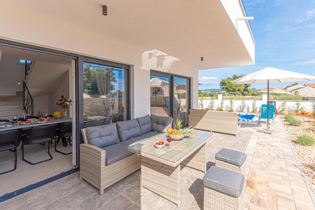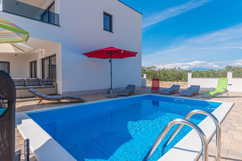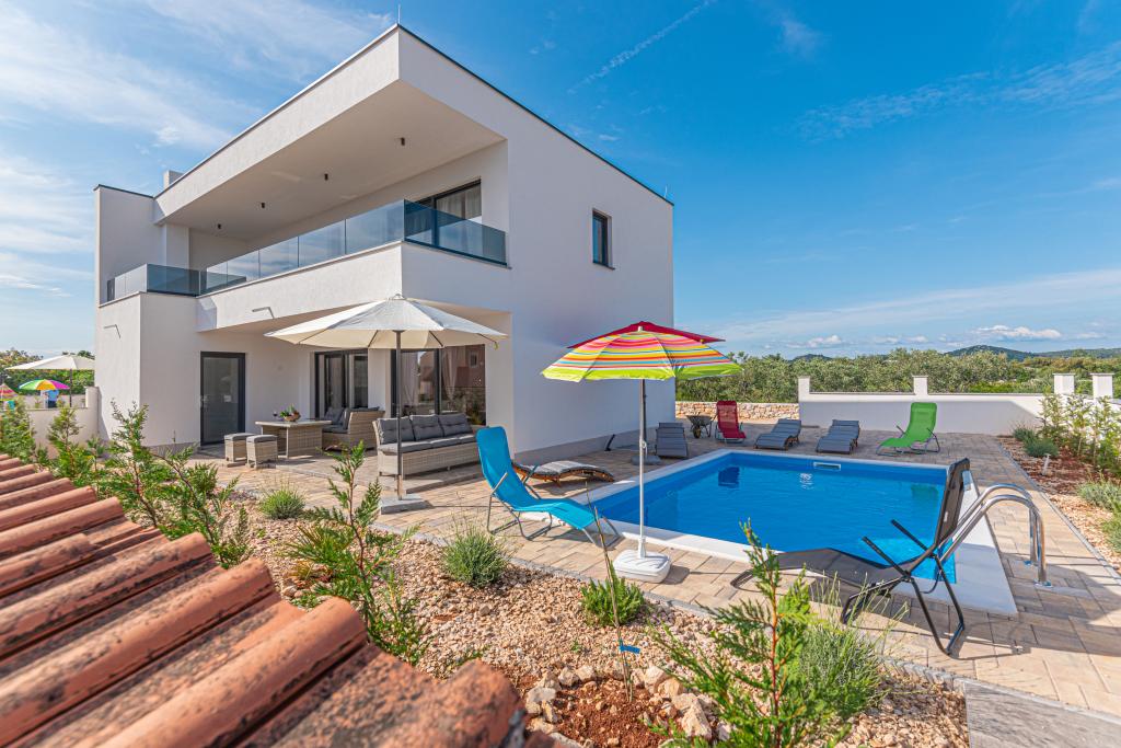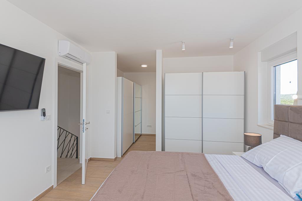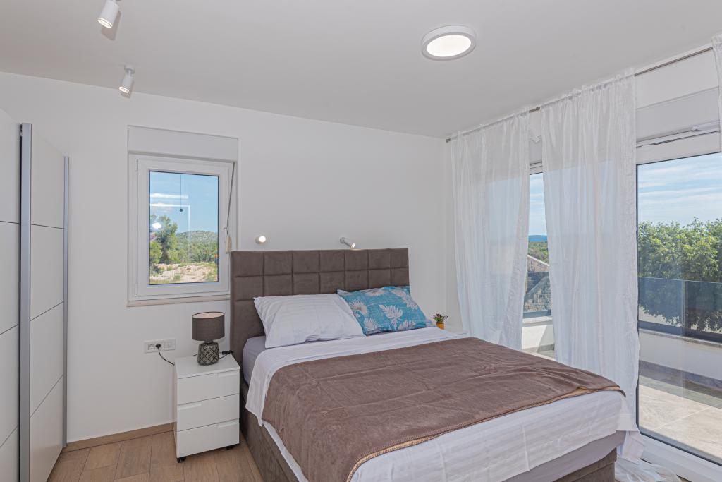 Villa Adriatic Sunrise – En fredelig ferie nær Šibenik Nyd afslapning i Villa Adriatic Sunrise, et smukt feriehus med opvarmet privat pool og værelser med aircondition, perfekt til en flugt fra hverdagen. Denne rummelige villa ligger nær den historiske by Šibenik og tilbyder en smuk udsigt fra den store terrasse, ideel til at nyde solen og de fredelige omgivelser. Villaen består af fire elegant indrettede soveværelser, en komfortabel stue og tre fladskærms-tv'er til din underholdning og afslapning. Køkkenet er fuldt udstyret med opvaskemaskine og ovn, så du kan nyde at tilberede måltider. Tre moderne badeværelser med brusere i stueetagen sørger for luksus og komfort under hele dit ophold. Udendørsområdet er ideelt til at nyde den friske luft, uanset om du slapper af med et måltid i den udendørs spisestue eller nyder en forfriskende dukkert i poolen. Denne villa tilbyder gratis privat parkering, gratis WiFi samt rene håndklæder og sengetøj for fuld komfort.
