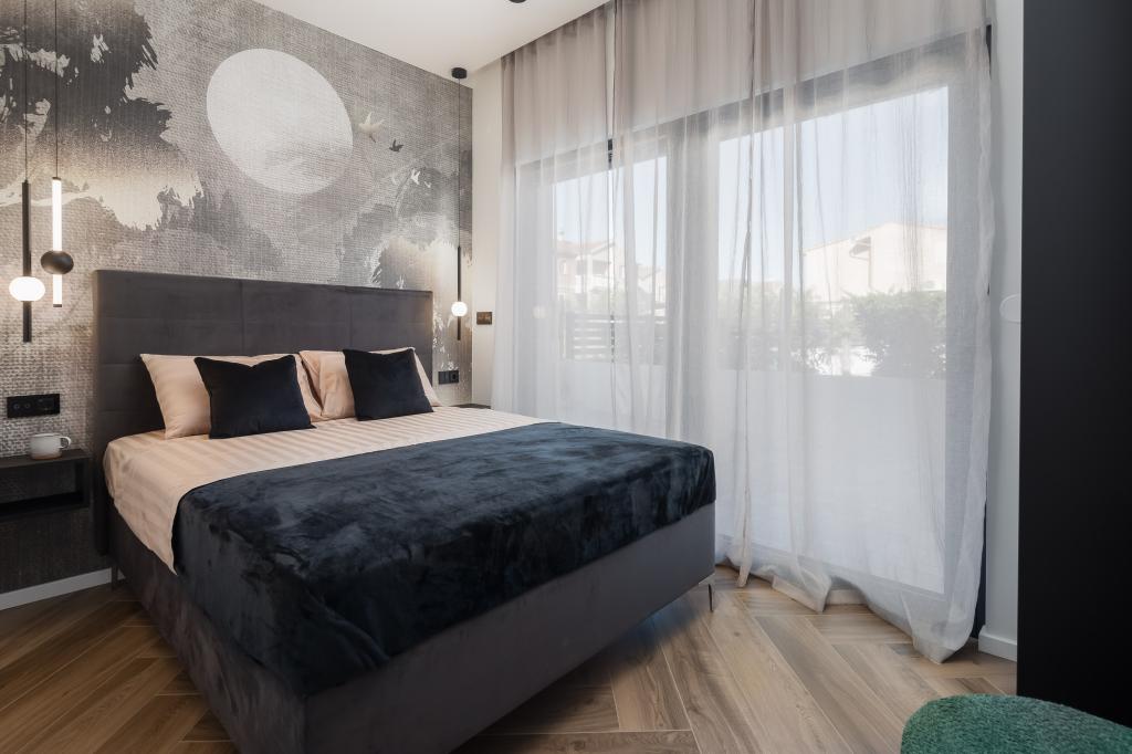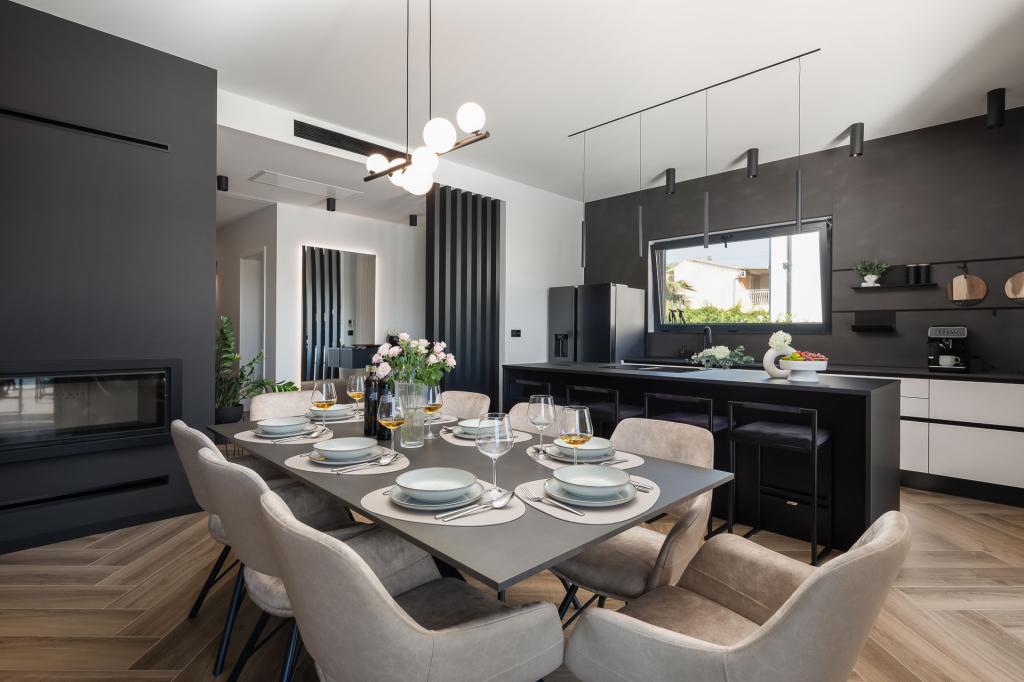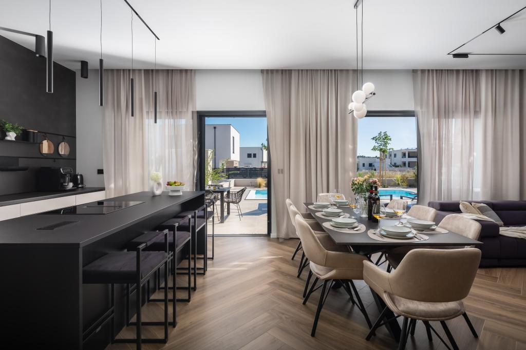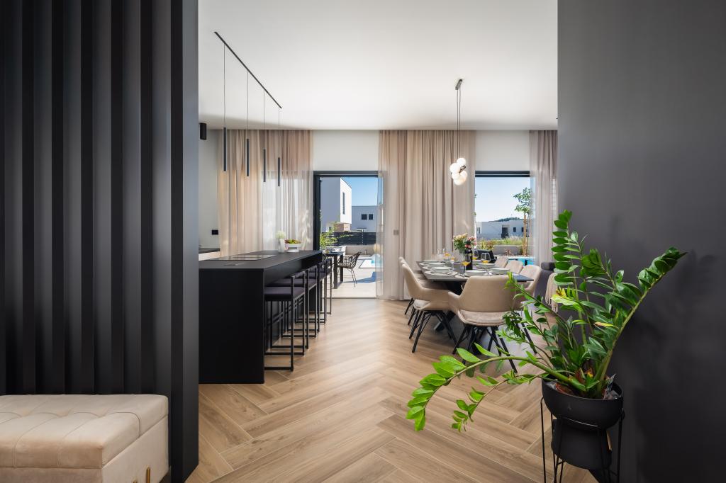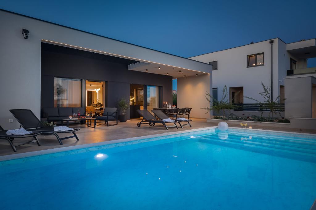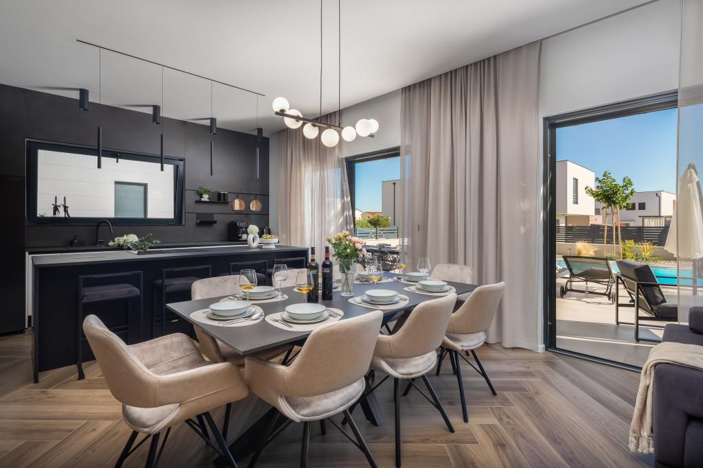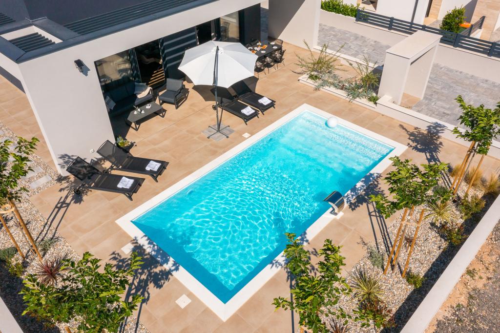 Smukt indrettet moderne villa i Vodice i en rolig landsby, ideel til din ferie. Huset er et etplanshus med et åbent rum med et stort køkken og en rummelig stue med en komfortabel sofa. Villaen har 3 soveværelser med tilhørende badeværelser. Du kan slappe af på den rummelige terrasse ved poolen og nyde tilberedte måltider fra grillen. Villaen er indhegnet.